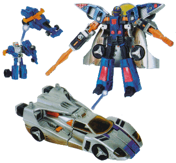 Firstly, you'll have to open out the wings, and you might want to remove the launchers to prevent them falling off during the transformation. Fold the doors down, swing the front out to either side, swing the robot legs down and extend them. Fold the rear half of the car down onto his back, slide up his shoulderpads. Fold down his groinplate and swing his arms down. Lastly fold out his feet and heelspurs and attach Minicons or missile launchers as desired.