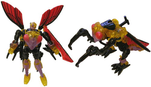 Again transparent yellow and black, Dirge has a purple tinge on his chest, a purple face on a yellow head, purple forearms and boots and red bug eyes on his chest. The shoulders, thighs and groin are black, along with the weapon's claws. The wings and shield are red and there's a Decepticon logo stamped on the inside of his shield. Dirge has white clenched teeth and unpainted eyes - since the head is entirely transparent there's a great lightpipe here. This colour scheme is somewhat strange - especially the extensive use of transparent yellow, but as on the beast mode, the colours are visually striking and the black helps offset the transparent yellow. It's not going to please everyone, but these colours are a lot better than those the original Buzzclaw toy had. There's still a fair amount of kibble, but the paints used work this time around.