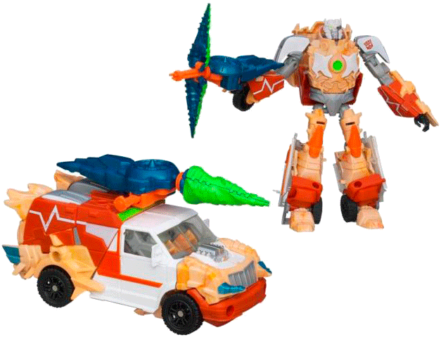 A white, ochre & beige ambulance with clear windows and some green behind the roof; which features no lightbar. Ratchet doesn't really look much like an ambulance, since there's no lightbar here nor any "Ambulance" markings. About the only marking that really defines him is a white EKG on either side. There are very striking & prominent beige greebly protrusions on the back end, around the rear wheels and on the hood, which sport some nice subtle orange rusty areas. There are also some metallic blue elements, most notable protrusion where his headlights would otherwise be. The wheels are black plastic affairs while there's a metallic silver protruding engine moulded on top of Ratchet's hood. The weapon adds more colour in the form of a dark metallic blue and some bright orange (along with more green). It's a rather jumbled colour scheme that breaks all sorts of design rules, but I'm personally quite partial to the beige with rust patches.