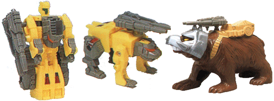 The bodyshape is fairly generic - head aside this could be any number of quadrupeds, even then the head isn't specifically that of a bear, more a fairly generic carnivore. There's not much play value here - the legs swing back and forth and his grey gun can plug into his back.