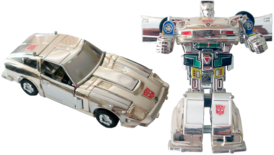 A chrome repaint of Bluestreak. The entire toy is chrome silver save for the black rubber tyres. Both the die cast metal at the front and rear as well as the plastic of the doors and roof. Even the windows are chromed rather than colourless. The lines of the targa top are still there, along with other features such as the doorhandles. The side windows are open, as on the regular version. He comes with the regular sticker sheet, which allows you to add some colour here, in the form of the two Autobot logo stickers. This is far from a realistic portrayal of a 280ZX and not a whole lot like Bluestreak, but is a nice concept for a limited edition variant.