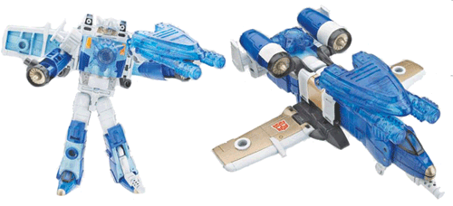 Again blue and white, although now the baby blue is a little more prominent, and the gold far less prevalent. The torso is two-tone blue, the groin, upper arms and thighs are white while his boots and forearms are blue. The wings stick out to the sides behind his shoulders, and the white edges bound baby blue undersides, which looks really cool. His head is gold with blue eyes - and with the sloping cheek and rounded head really looks like that of Tutankhamen with a white night vision scope. The blue eyes have a lightpipe but it's hard to see with the shiny gold paint around them. The paint mask here is great, and while he loses the stamped Autobot symbols the spark crystal is now central on his chest.