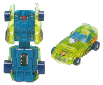 A transparent fluorescent yellow sport car with blue windows, Sizzle has a chrome silver engineblock in front of the windshield and non-chrome gold side exhausts just in front of the doors. The tyres are purple (why wouldn't they be?!) and there are red and yellow flame stickers above the larger rear tyres. There's a G2 Autobot logo sticker on the front of the hood, inside the rubsign indent. This sticker is rectangular with a black background - this black is the only muted colour on this car. The chrome is really the only colour here I don't object to, although the blue windows could work well on a decent colour scheme. Sizzle looks like a rainbow threw up on him.