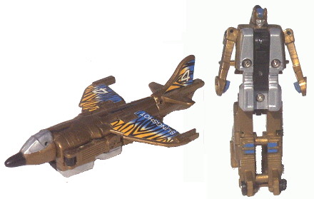 A shiny gold Harrier, with a silver cockpit, black rubberised nose and a fair bit of kibble visible. He has yellow, black and blue stripes on the wings and tail with "4" on the right wing & tail and his name on the left wing. So having your name on your wing isn't a great disguise, but then he's already a golden harrier so who cares, right? Anyway, as mentioned, he has robot bits clearly visible. The fuselage noticeably widens just behind the cockpit, and the arms are easy to see on the sides. While the kibble is all gold, it affects the shape of the plane mode and has never sat well with me.