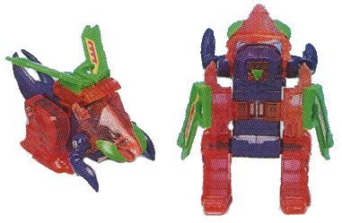 A purple and fluorescent transparent pink insect with fluorescent green wings and mouthparts, Sparkstalker is a rather unsubtle repaint of the G1 toy of the same name. His body, tail and forelimbs are all purple, which hardly makes for a neutral base - especially with the supporting colours we have here. The only subdued colour on this toy is the silver paint used on his eyes - which ends up lost amongst the transparent pink head anyway. Simply put, this colour scheme is nothing short of appalling.