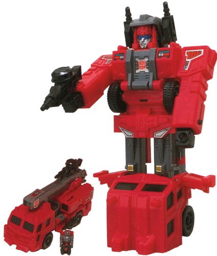 The sculpt on this fire truck is better than on many 1988 Transformers, and while he's not as realistic as the Autobots of 1985, the effort than has gone into the mould is quite good. Having said that, everything is red, so you won't notice a lot of the detail at a glance. There are some moulded rungs on the ladder, headlights and strobes on the roof, with a lot of generic detailing. More than anything else, the strobes disappoint me - even solid black plastic would have been better than just red. There are a couple of stickers, but only the Autobot symbols on either side of the ladder really mean much. The splashes of colour are nice, but I would have preferred some more fire truck detailing.