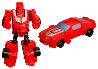 A red Camaro with silver stripes on the hood - but not on the rear as on Legends Bumblebee, the original toy of this mould. The windows are metallic blue - including the rear window this time. The colour scheme is a simplified version of that seen on the deluxe version. Cliffjumper has silver headlights and grille and black plastic tyres, rounding out a straightforward yet plausible colour scheme. The colour scheme is good enough that it's easy to not consider that while the Deluxe is a modern Camaro, this one is actually a 70s Camaro.