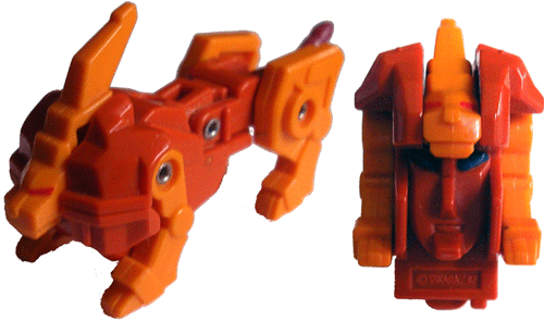 An orange lion with a burgundy tail, Lione's body is a darkish orange while his limbs and head (but not his mane) are a light orange. The smallish eyes are painted red. While the lion shape isn't all that fantastic, it's better than than of the squashed Steeljaw. The colours are really nice, even though you'd probably expect the brighter orange to be on his body. The legs are in a somewhat squat position, which isn't terribly lion-like, since they're pack hunters rather than sit and wait predators like many cats. At any rate, it's still a nice lion mode.