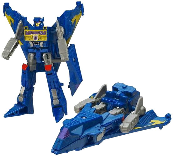 A blue jet which is more robot kibble than stealth jet, Soundwave is a triangular vehicle with gold on the leading edges of his wings and some grey robot kibble on his fuselage - including very visible robot arms. The cockpit window at the front is painted a dark metallic purple colour, and while the idea is good, it needed to be brighter - the arms are far more visible, which is not a good thing. The larger toy has more visible jet details, and looks much better as a result. There is a Decepticon symbol visible at the back end - the gold robot chest - but it's upside down in this mode. Don't look from the back - the face is also visible.