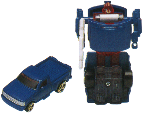 It's a fairly good truck mode for it's size, all up, even if the detailing is a little unusual. The metallic paint is a nice touch, and it really make for a nice looking truck, overall. He can stow his gun in his tray, although I wouldn't recommend this, since the tray's paint could scratch.