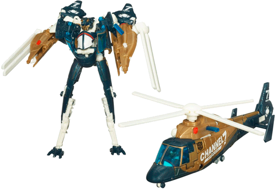 A gold news chopper with navy blue on the nose, lower edges and the back of the tail, Blazemaster has white rotor blades. The sides read "CHANNEL 7" in large white lettering with "ACTION NEWS" underneath in gold, surrounded by white. The tailfin sports "7 NEWS" in white lettering. His cockpit windows are transparent blue while there's a black Autobot logo stamped on the portside and a white fuelpod on the starboard side. The colours loosely match those of G1 Blazemaster, and while this is a civilian chopper and the Micromaster was a military one, the colour scheme makes this tribute pretty obvious (along with the fact that the name Blazemaster has never been reissued until now). It's a good colour scheme which is credible enough, even if most news choppers tend to be white rather than gold - the colours on the body of this vehicle are kept simple and look decent.