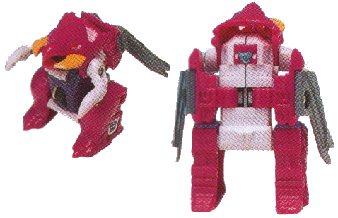 The Firecons have quite possibly the worst robot mode proportions of any Transformers. Ever. The arms are attached to the waist, and of course attach at the wrists. The legs attach to the sides of the central block, sitting directly below his hands, rather than below the torso. The back edge of the animal head sits above the rectangular central block, forming kibble. Rounding all of this out is the fact that's wider than he should be for this height, and wears the wings as arm kibble.