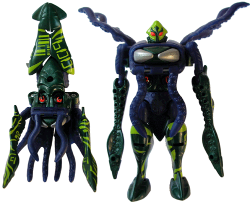 As in the beast mode, Claw Jaw is a mix of green and blue in this mode. His head has some nice fluorescent green swirls on it, there's some green on his boots too, left over from the squid mode. His eyes are red and there's silver panels on his chest (the mouthparts). He has giant blue "wings" pointing out and up from his shoulders formed from his rear tentacles.